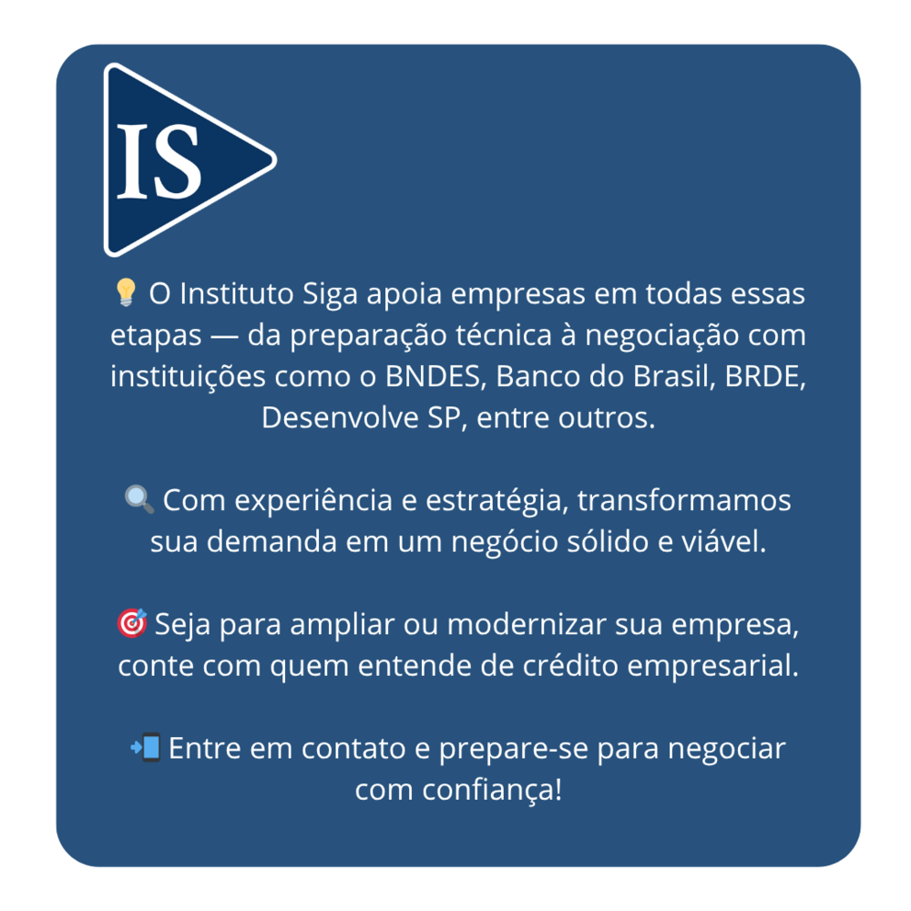 💡 O Instituto Siga apoia empresas em todas essas etapas — da preparação técnica à negociação com instituições como o BNDES, Banco do Brasil, BRDE, Desenvolve SP, entre outros.